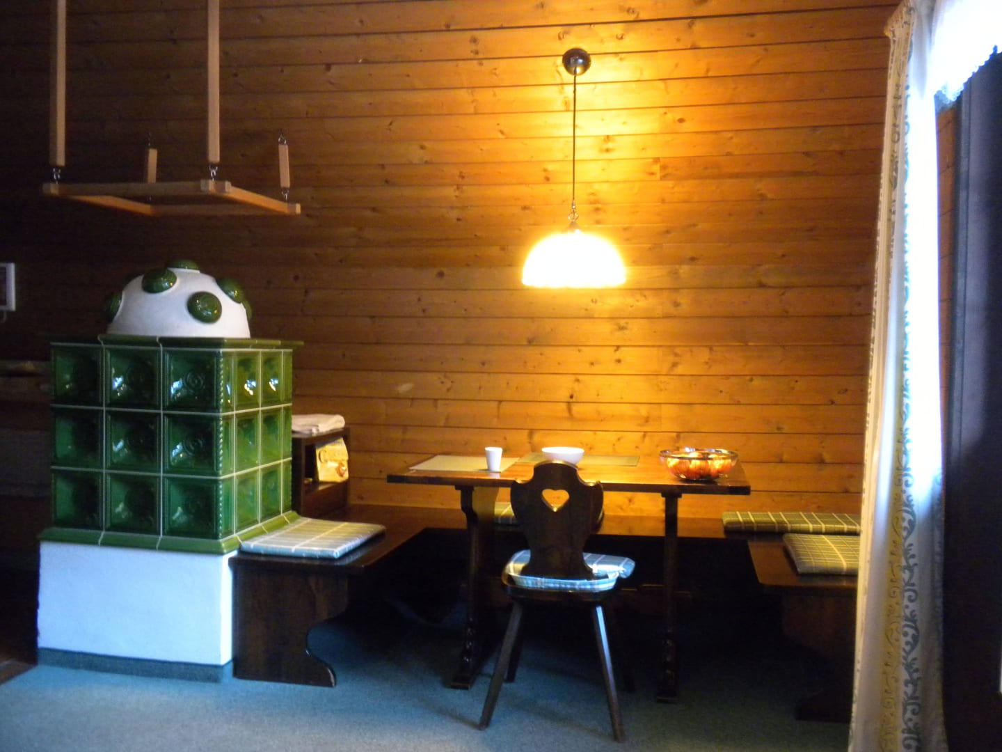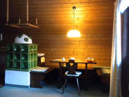 Gemütlichkeit am OfenDie gemütliche Sitz- und Ess- ecke mit dem behaglichen (elektrisch) geheiztem Kachelofen verleiht der Wohnung viel Atmosphäre.