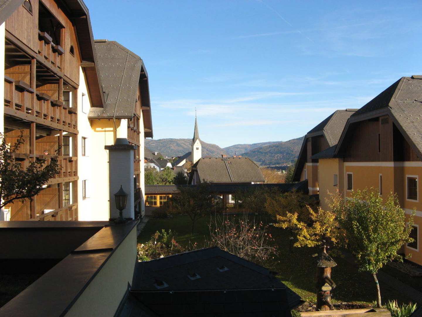 Traumwetter Ende OktoberDer Blick von unserem Fenster auf einen Teil des Resorts, im Hintergrund die Pfarrkirche von St. Michael