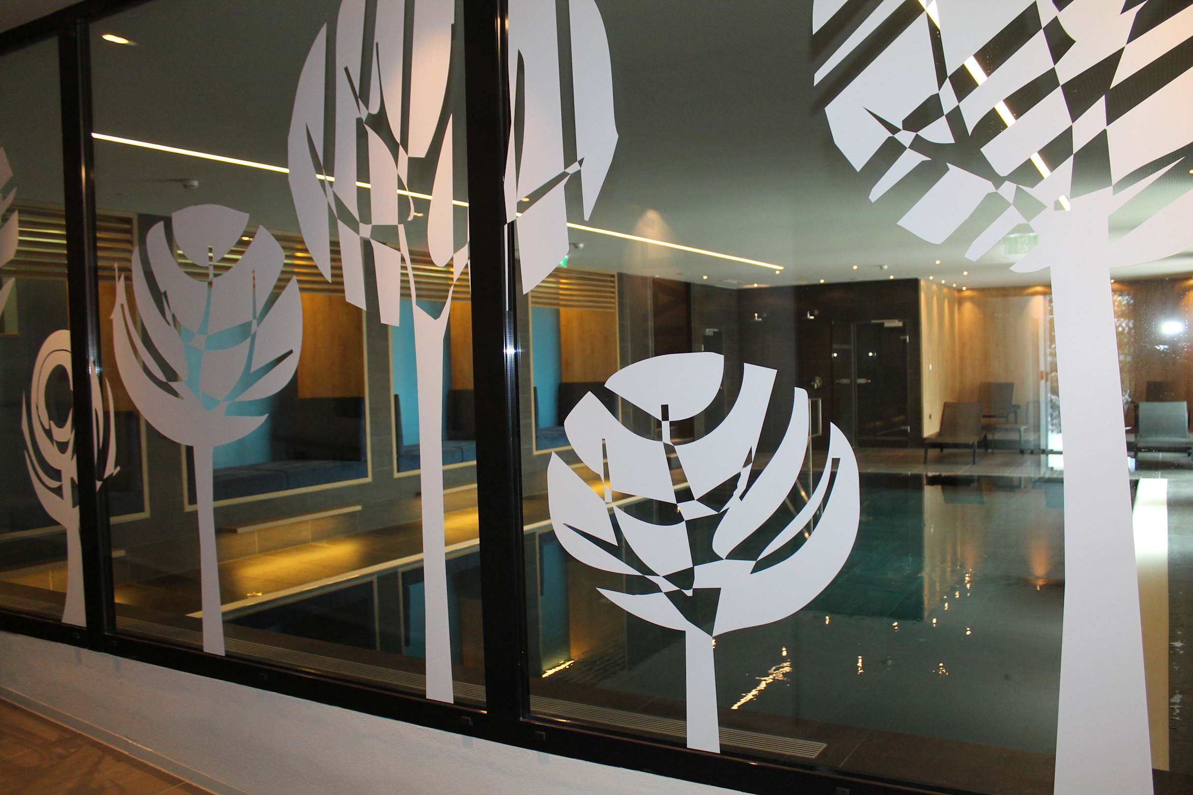 Glaswand von der Lobby zum überdachten Schwimmbad