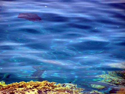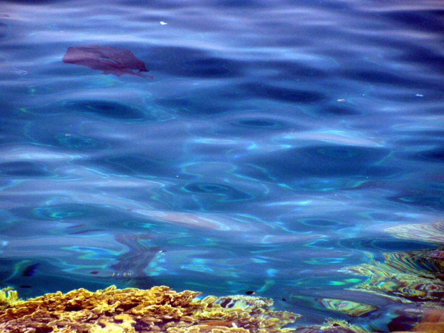 Schwarze Müllsackteile treibend im Wasser. Diese und tausend anderer Einkaufstüten, teils unversehrt, teils zerfetzt im Wasser um und in den Korallen treibend.