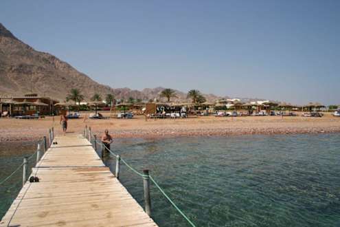 Blick vom Steg auf das HotelBlick vom Steg des Hotels Happy Life Village in Dahab in Richtung des Strandes mit dahinter gelegenem Hotel.