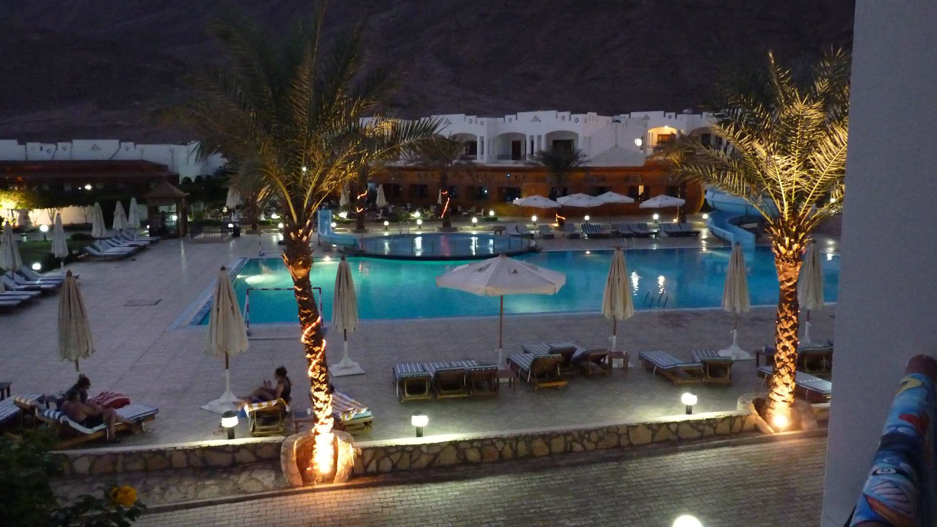 Pool vom Balkon, gegenüber das Restaurant für Früh
