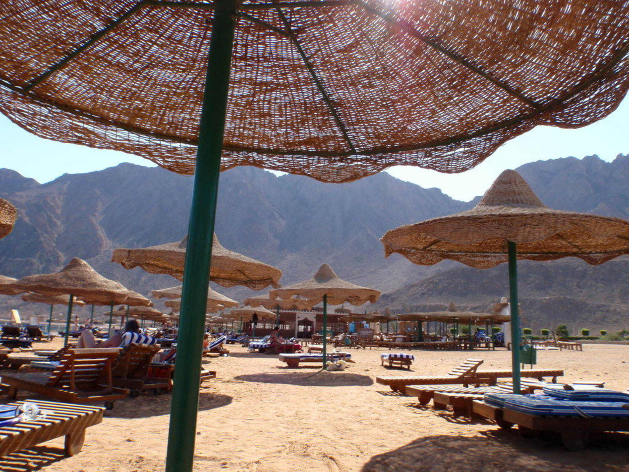 Hotelstrand mit Bergkette im Hintergrund