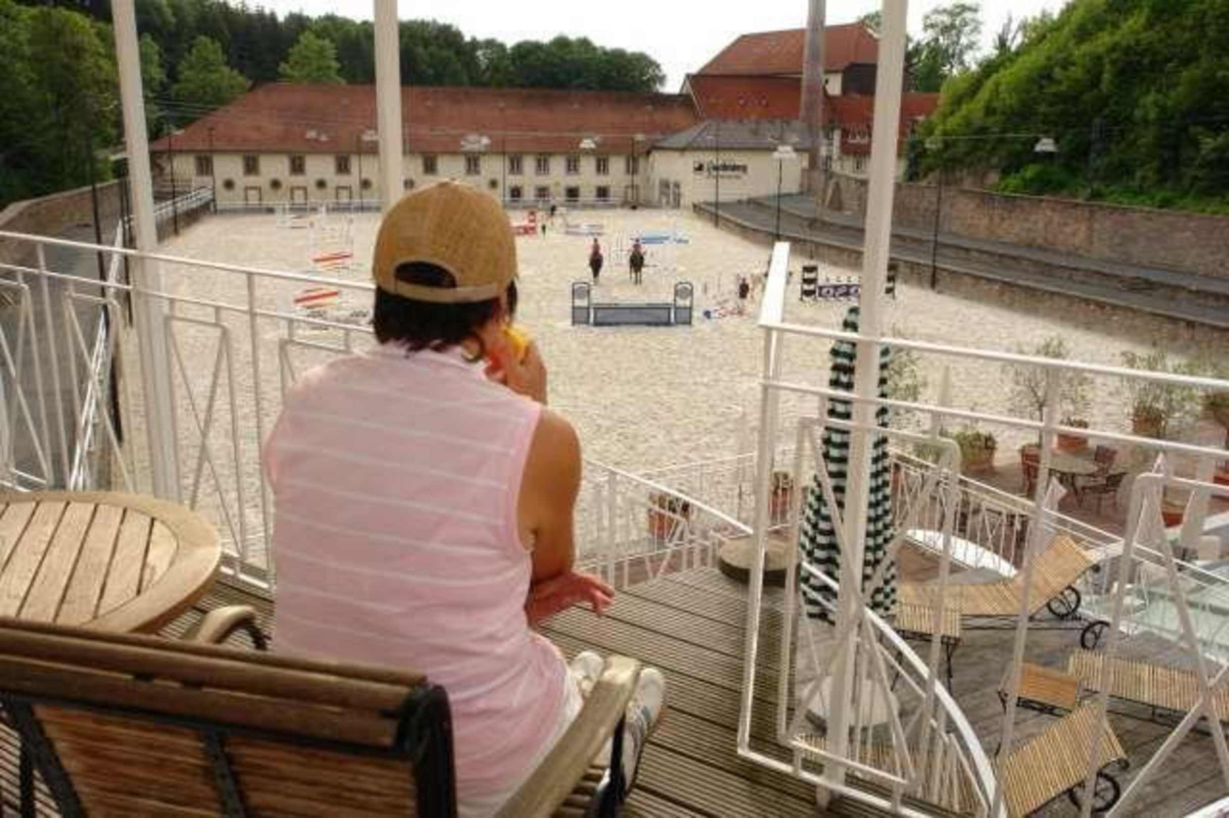 Zimmerterrasse mit Blick auf den Reitplatz und die Hardenberg Kornbrennerei