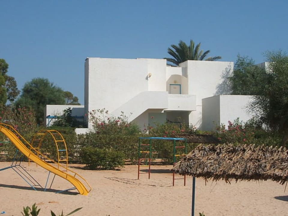 Einzelner Bungalow mit Kinderspielplatz im Vordergrund