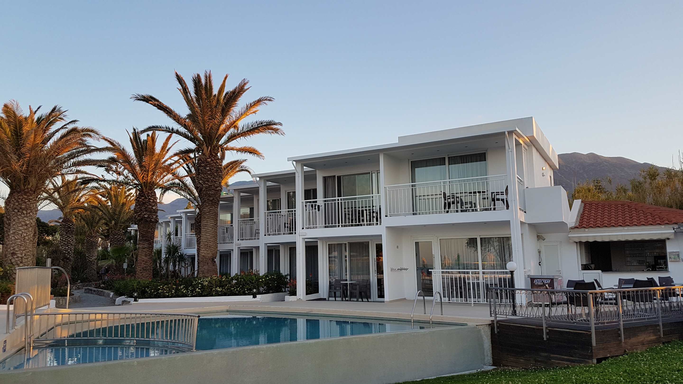 rechts beginnt die Strandbar.Zu sehen sind die 400 er Zimmer mit MB. Minipool