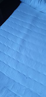 Durchgelegener Topper des Doppelbettes. Stärke = max. 1,5 cm. Und ja, man sieht hier schon das Laken.