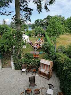 Blick vom Balkon in den Garten, im Hintergrund der Werbellinsee