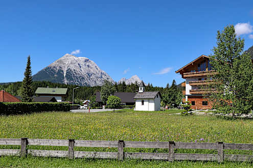 Blick vom Grundstück auf die kleine Kirche