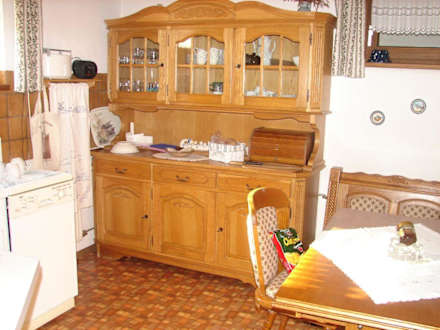 Küche mit Sitzecke und Geschirrschrank.