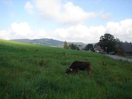 Neben dem Ferienhaus befindet sich dieses Grundtstück mit kühen, Natur pur.