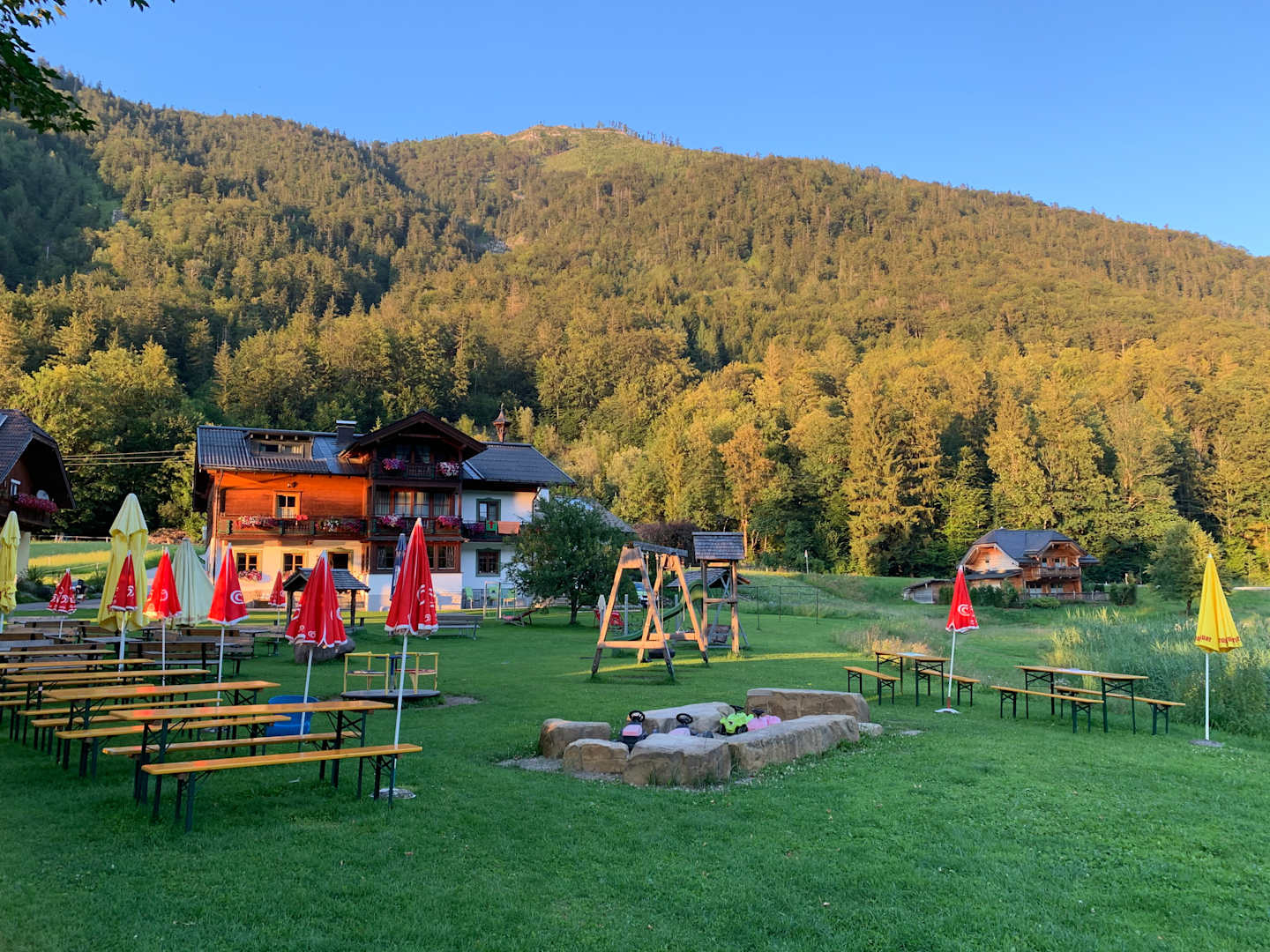 Hinteransicht auf Haus Hirschpoint. Viele Spielmöglichkeiten für kleinere Kinder.