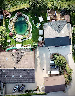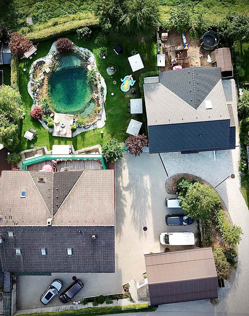 Haus und Teich von der Vogelperspektive