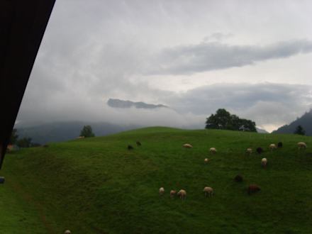 Vor dem Haus die grünen Wiesen mit Schafen