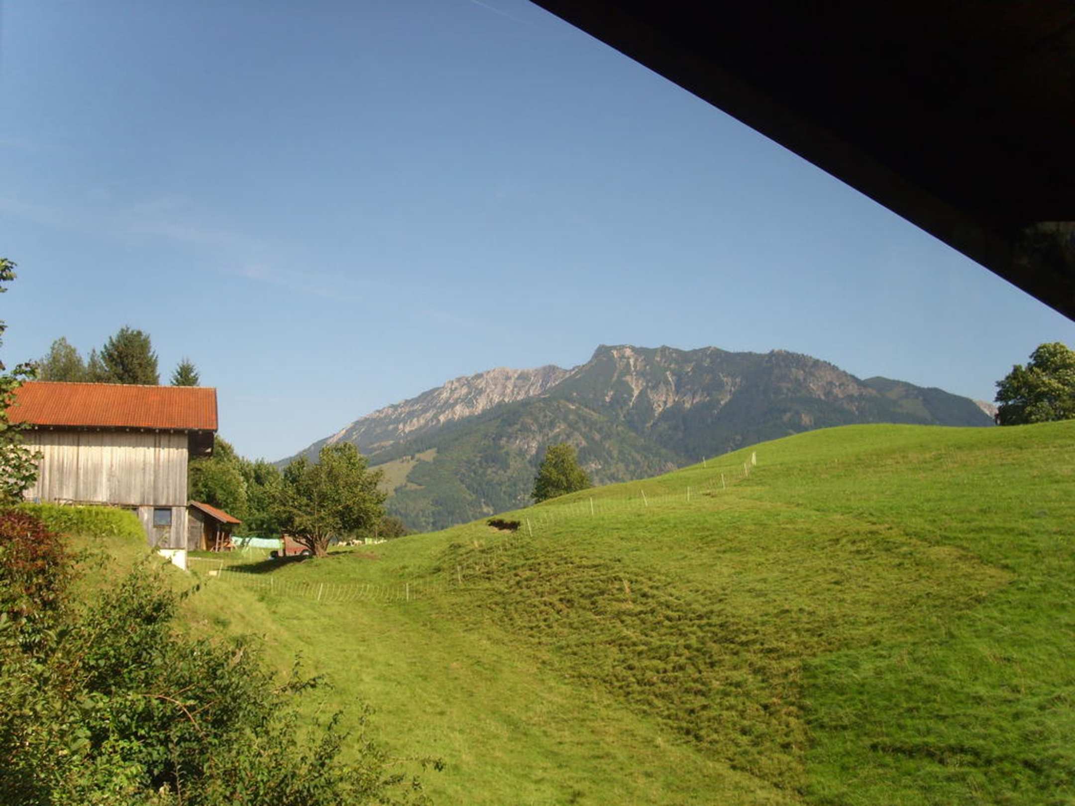 Blick zu den Wiesen und Bergen vom Balkon