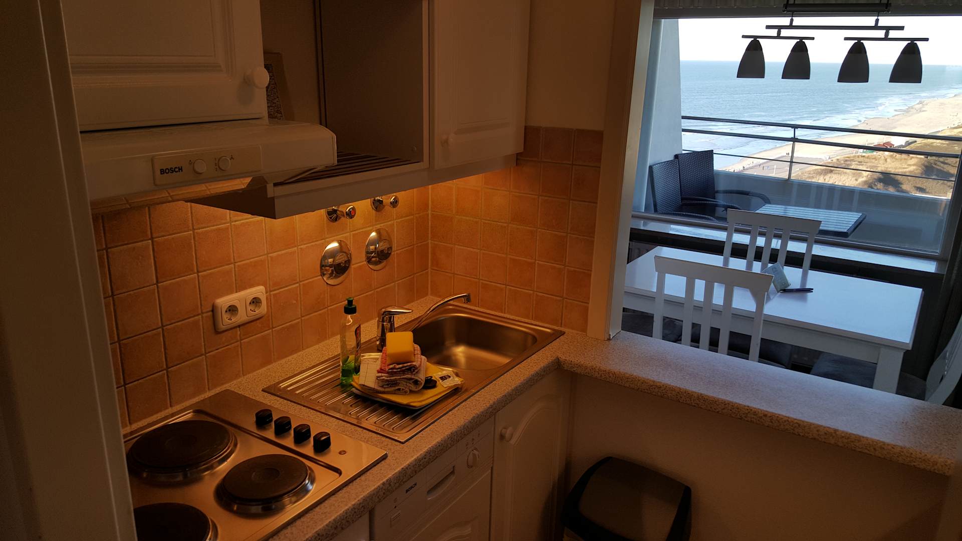 Blick aus der Küche über die Essecke zum Balkon.