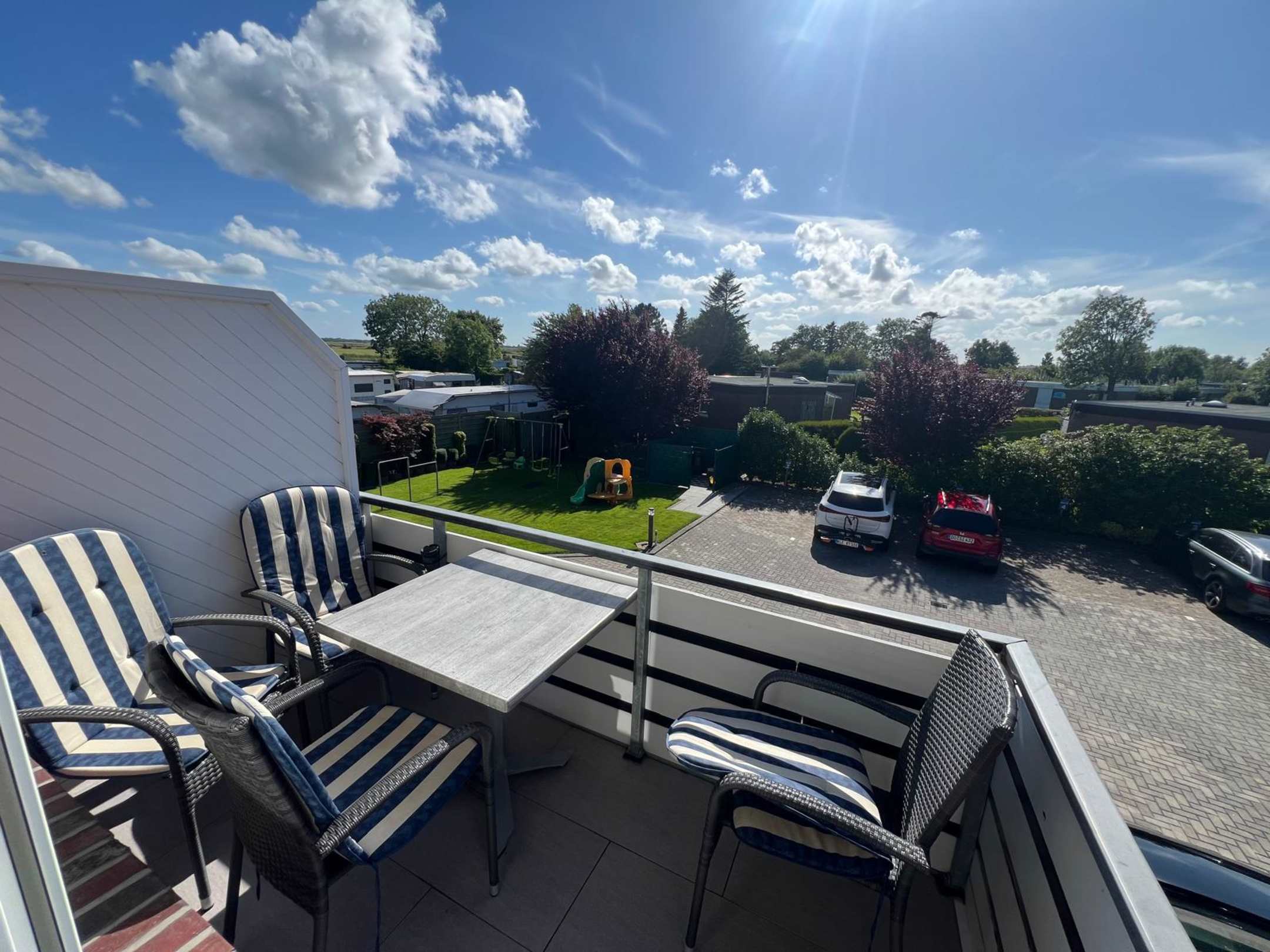 Balkon und Ausblick vom Balkon mit Parkplätzen hinter dem Haus