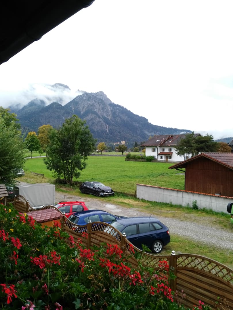 Blick aus dem Balkon auf Berge und Schloss Hohenschwangau
