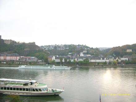 Von den zur Rheinseite gelegenen Zimmern des Hauses Morjan hat man einen schönen Blick über den Fluss. Links erhebt sich die Feste Ehrenbreitstein.