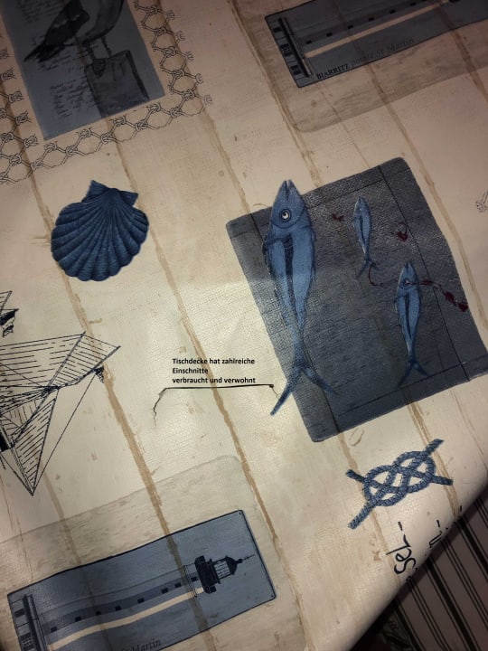 Risse und Löcher in der Tischdecke und verklebt.