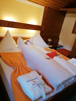liebevoll dekoriert mit Bademantel, Schoko, Blumen und Herz