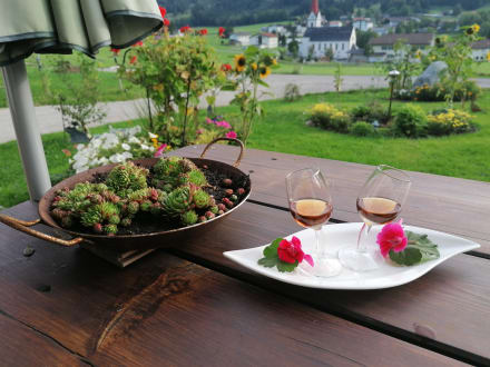 Schnäpschen offeriert von der Vermieterin im Garten