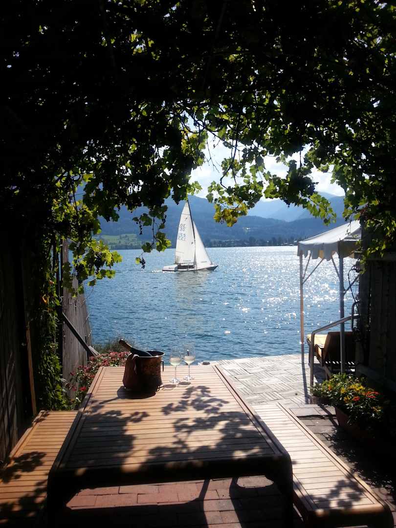 Seegarten mit Badesteg und Sitzplatz unter Weinlau