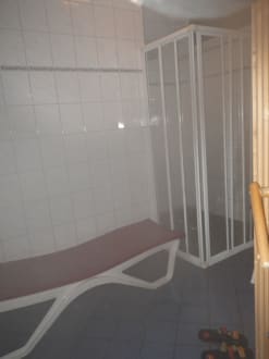 Dusche und Ruheliege im Saunaraum
