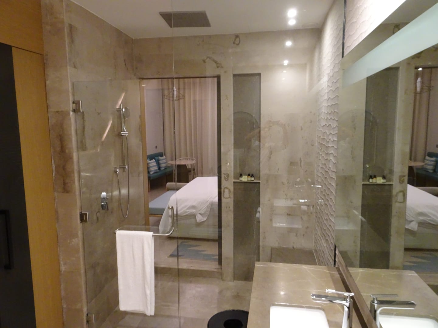 Blick vom Bad durch die Dusche in das Zimmer