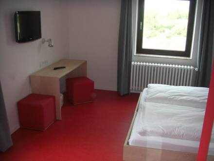 Zimmer zur Ostseite, links ein kleiner Tisch mit LAN-Buchse und Flachbildfernseher, rechts das Doppelbett, dass man auch auseinanderziehen kann