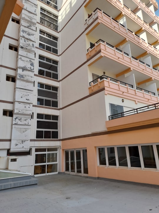 Blick von der Zimmer-Terrasse auf den "Innenhof" mit angrenzender Hochhaus-Bebauung