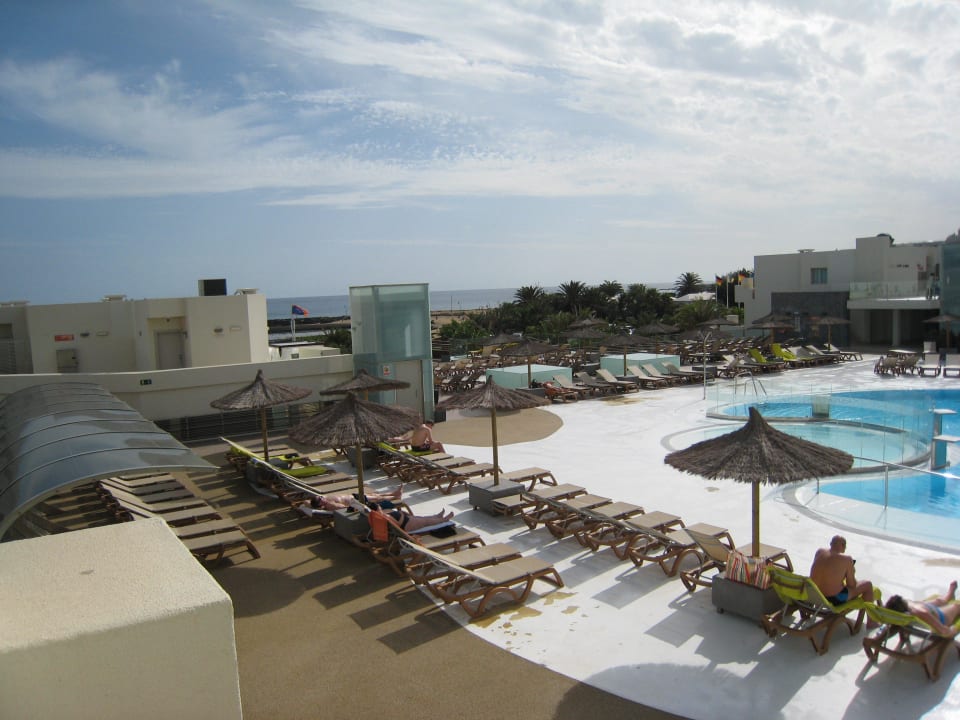 Blick vom Zimmer zum Pool und Meer