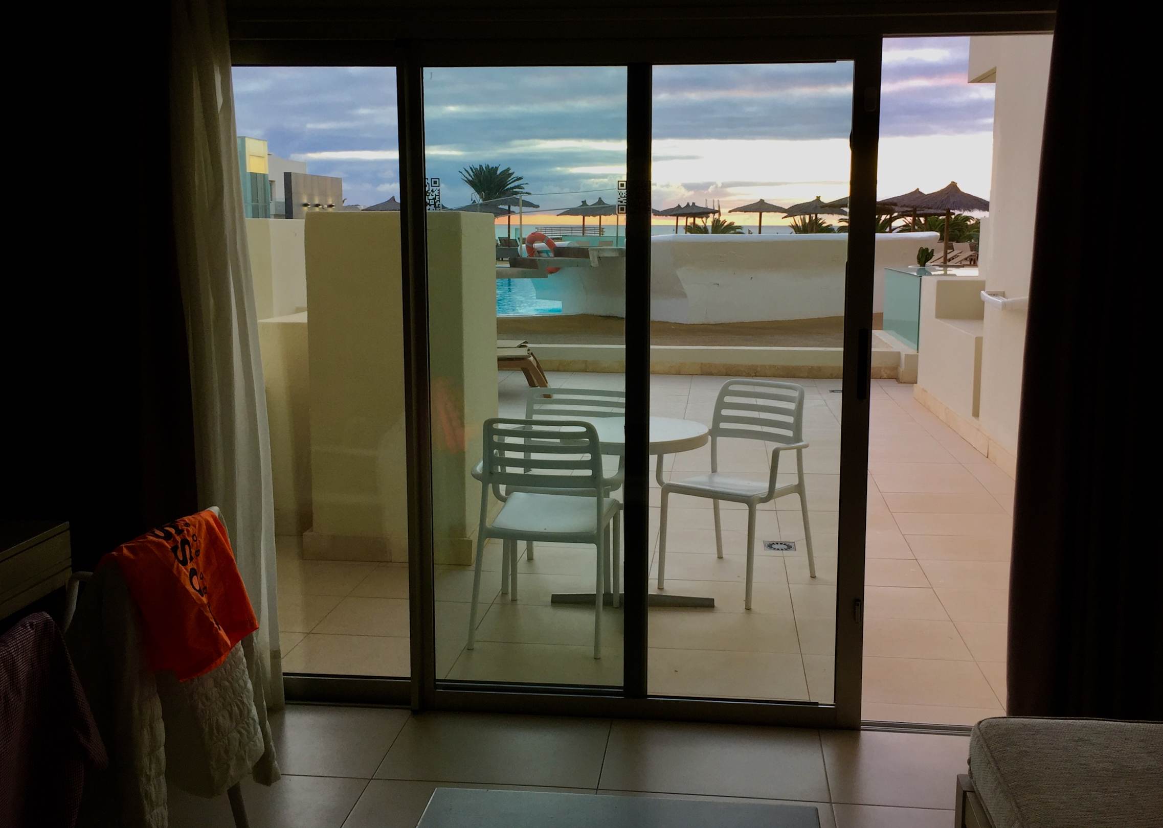 Blick vom Zimmer Richtung Pool und dahinter Strand