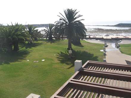 Blick vom Hotel zum Strand bei Ebbe