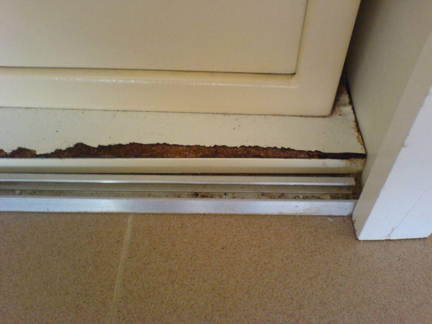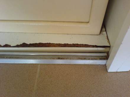 Türe defekt, abgeplatztes Holz, Schmutz ohne Ende