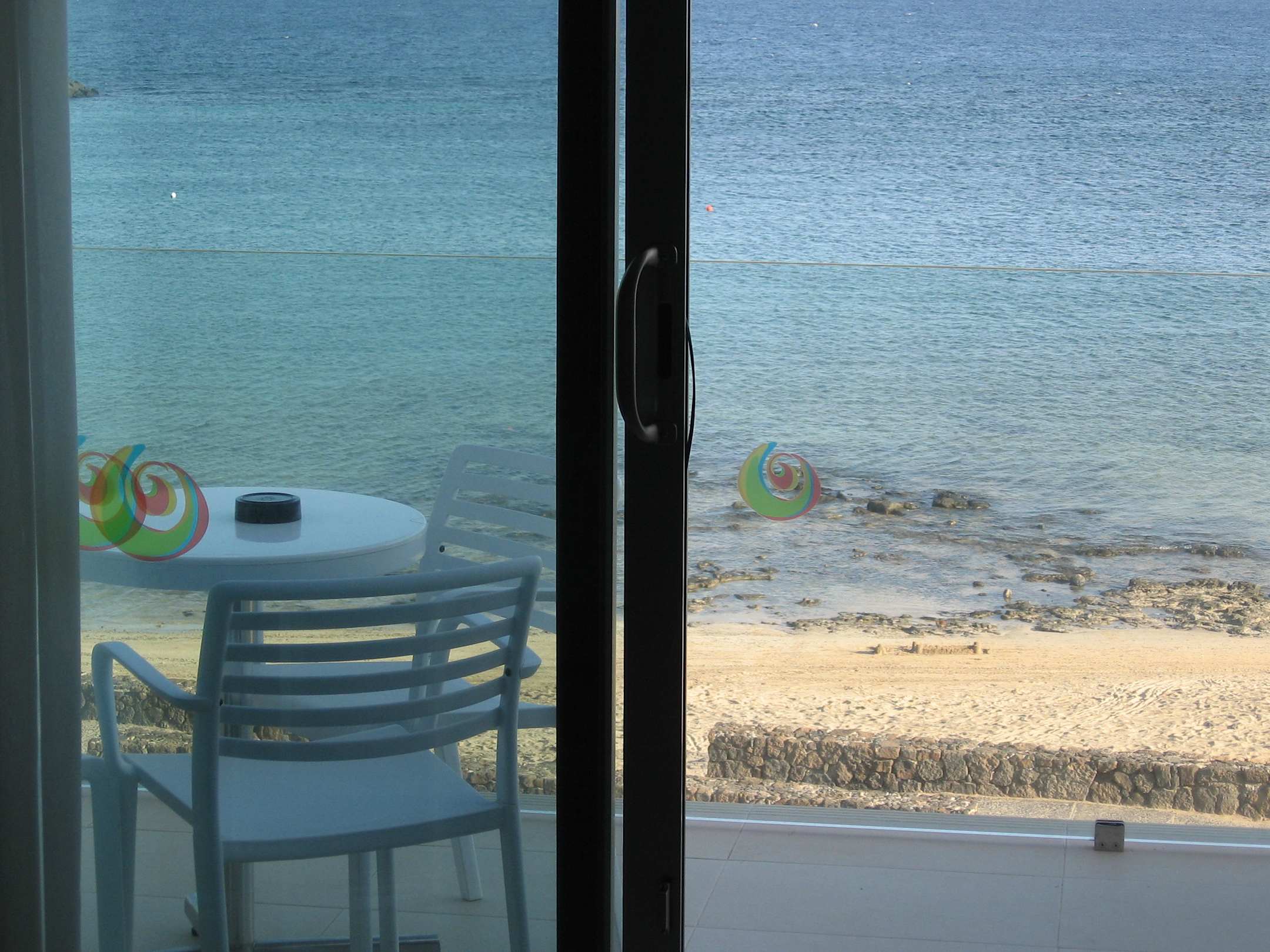 Blick aus dem Zimmer auf Balkon und Strand