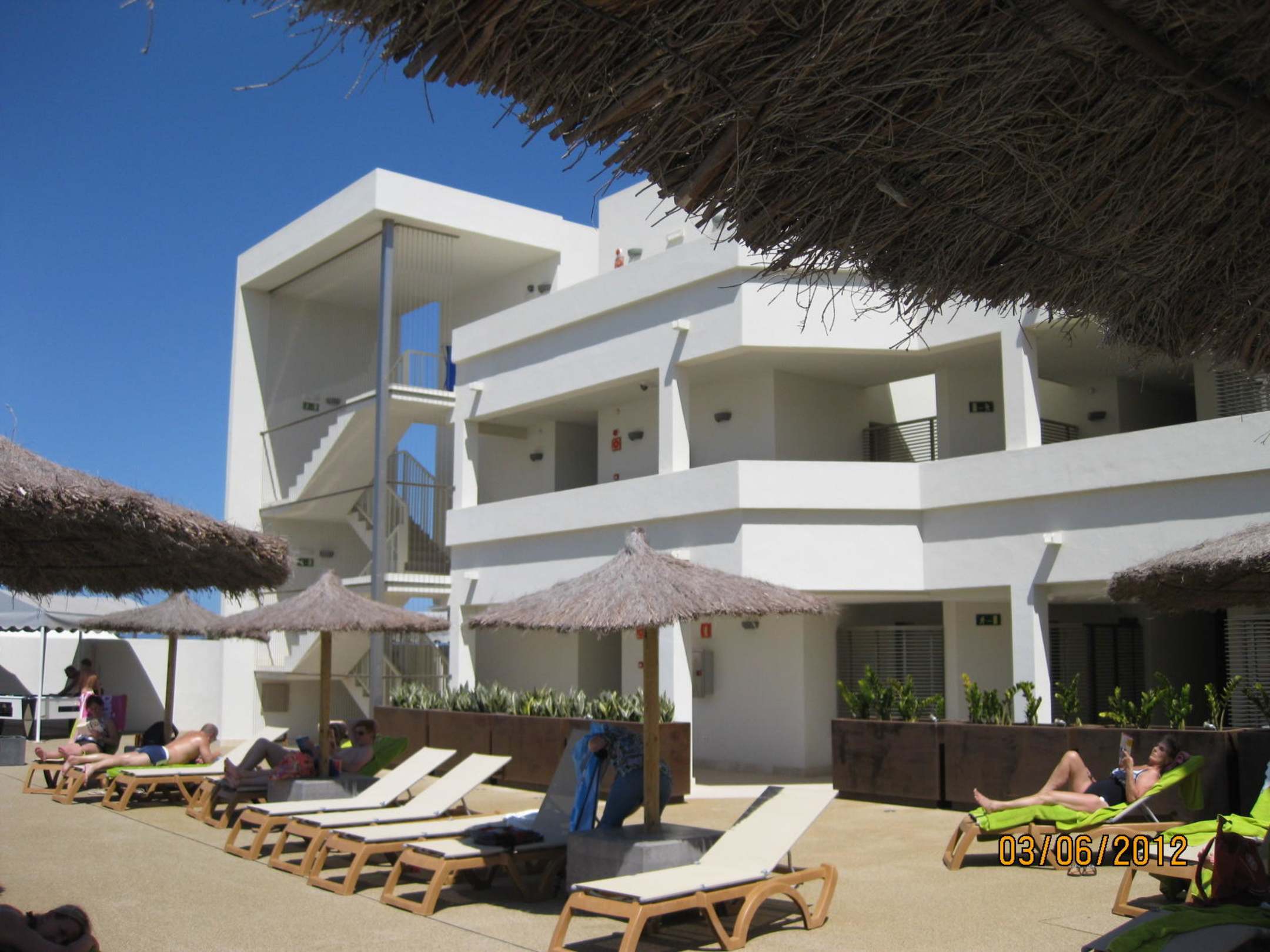 Sonnenliegen an der kleinen Poolanlage; dahinter Hotelzimmer