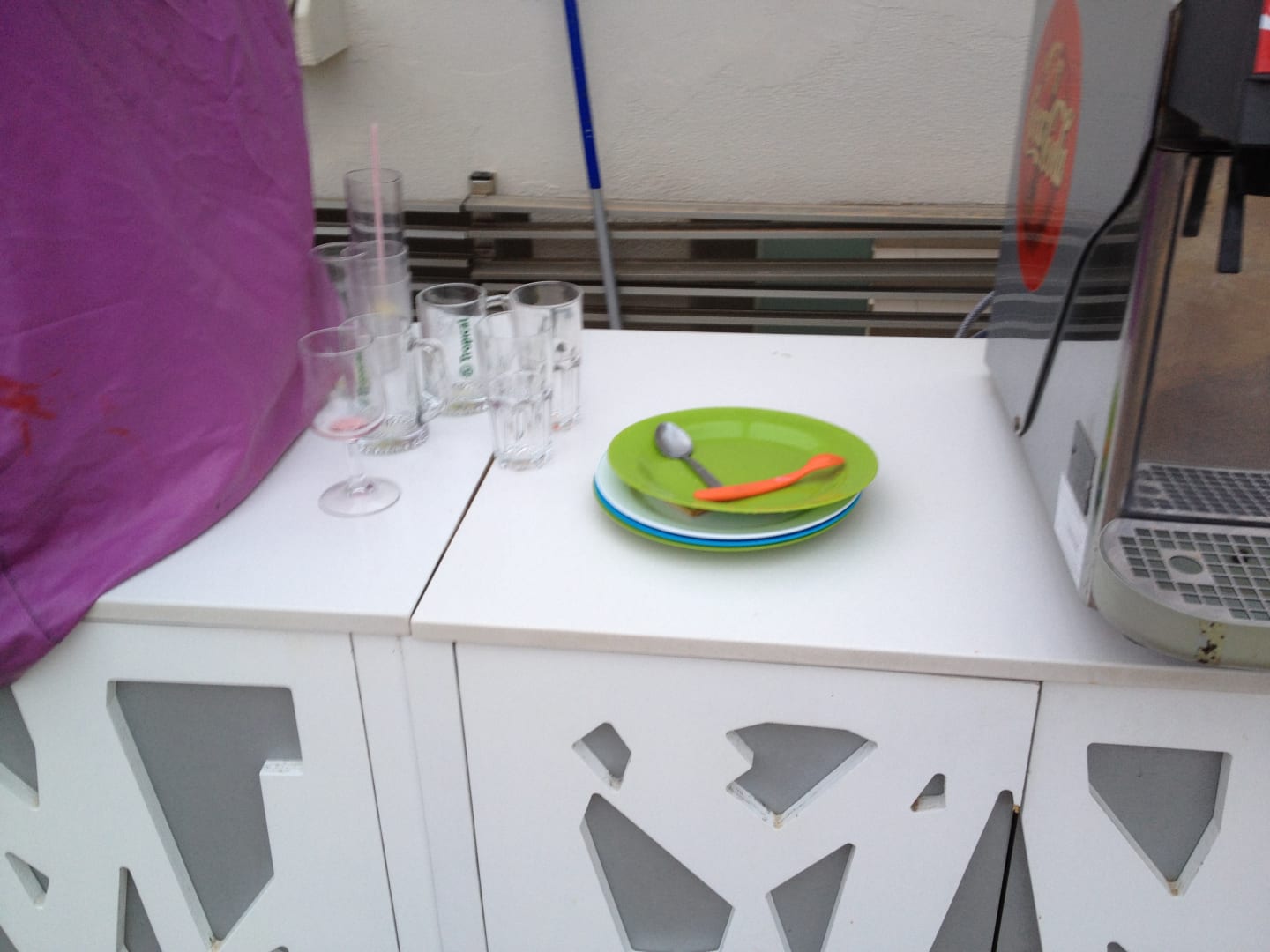 Gläser und Teller am Pool vom Vortag