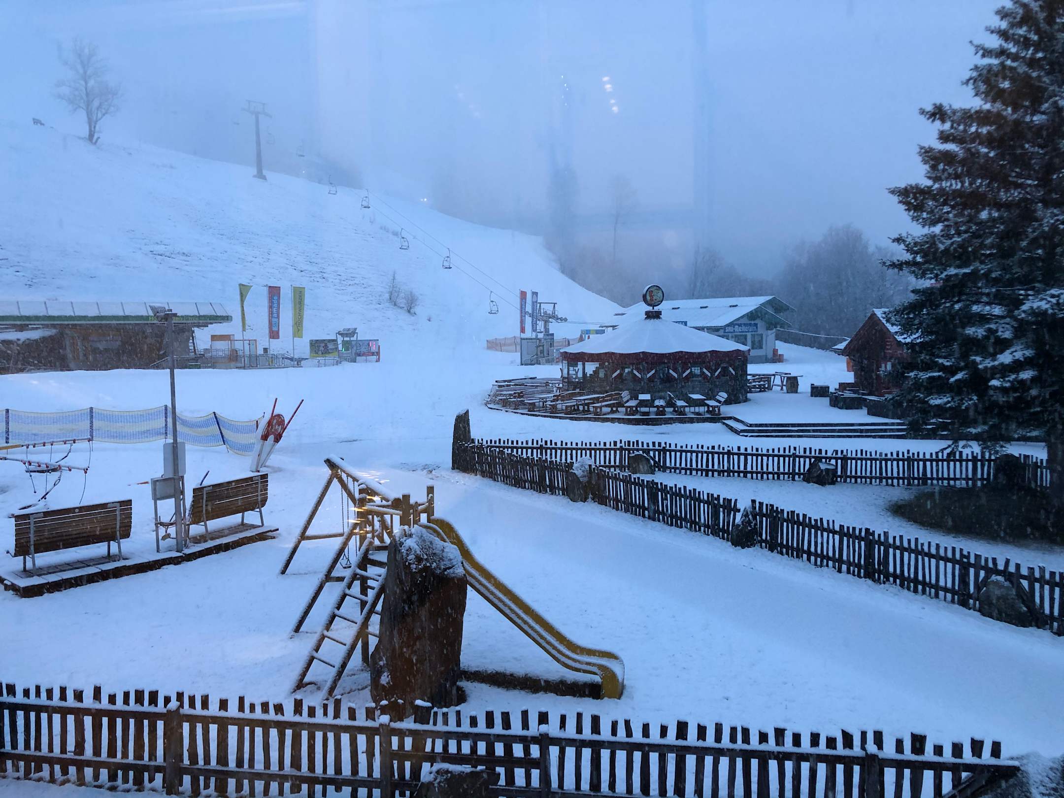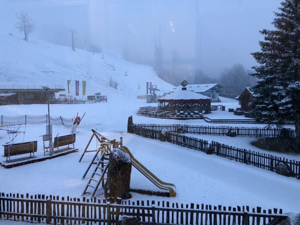 Frisch verschneiter Blick auf den Schirm und die Talstationen
