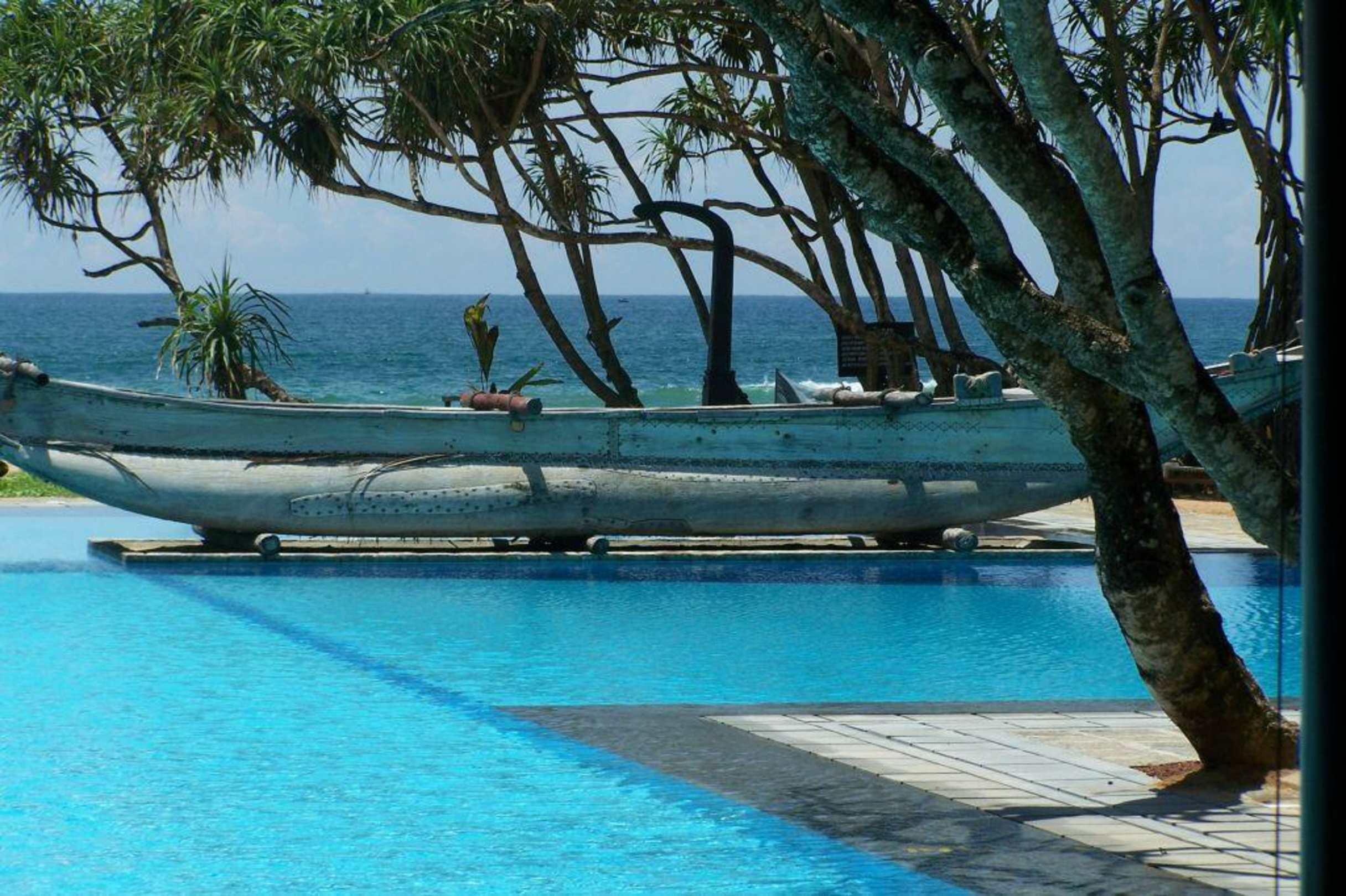 Poolanlage mit Blick auf Meer und Strand.