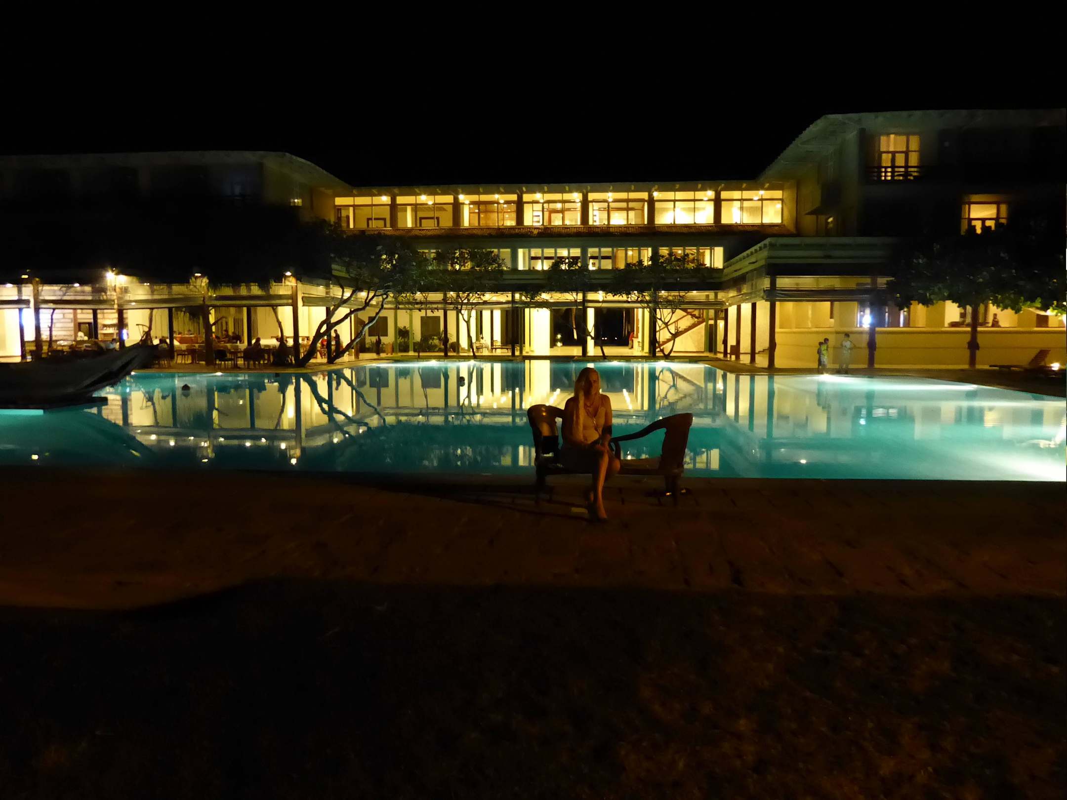 Blick am Abend vom Strand auf das Hotel