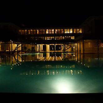 Hotellobby und Pool bei Nacht