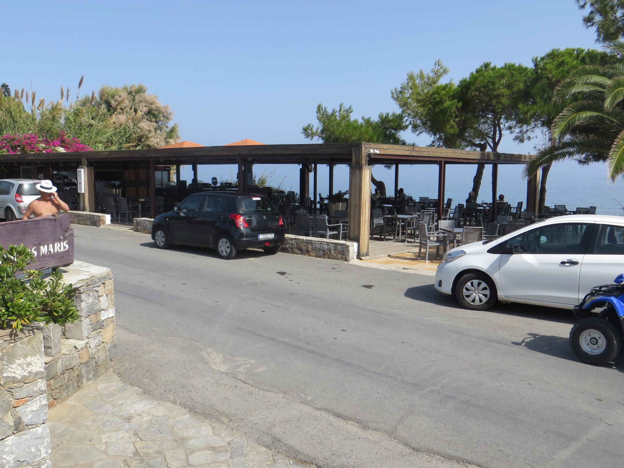 Пляжный бар через небольшую дорогуЧуть левее этого бара, наискосок через крошечный сквер, ближайшая к отелю бухточка для купания.