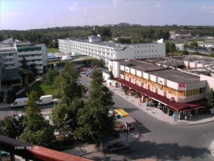Geschäfte vor dem ImperialSicht vom Balkon des Imperial aus dem 7. Stock auf den Platz vor dem Hotel. Zu sehen sind rechts diverse Geschäfte sowie im Hintergrund das Hotel Kotva. Links von Bäumen bedeckt befindet sich eine Minigolf-Anlage.