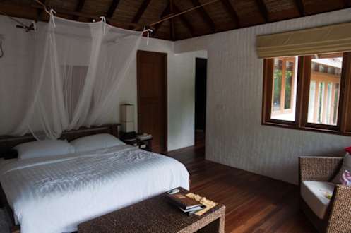 Schlafzimmer Raamba RetreatSchlafzimmer Raamba Retreat mit Türe zum Badezimmer und Durchgang zum Ankleidezimmer und Wohnzimmer (rechts)