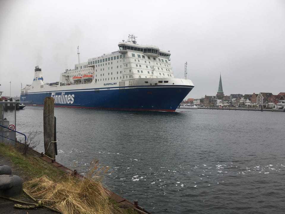 Blick vom Privall auf ein Fährschiff. Im Hintergrund die Vorderreihe