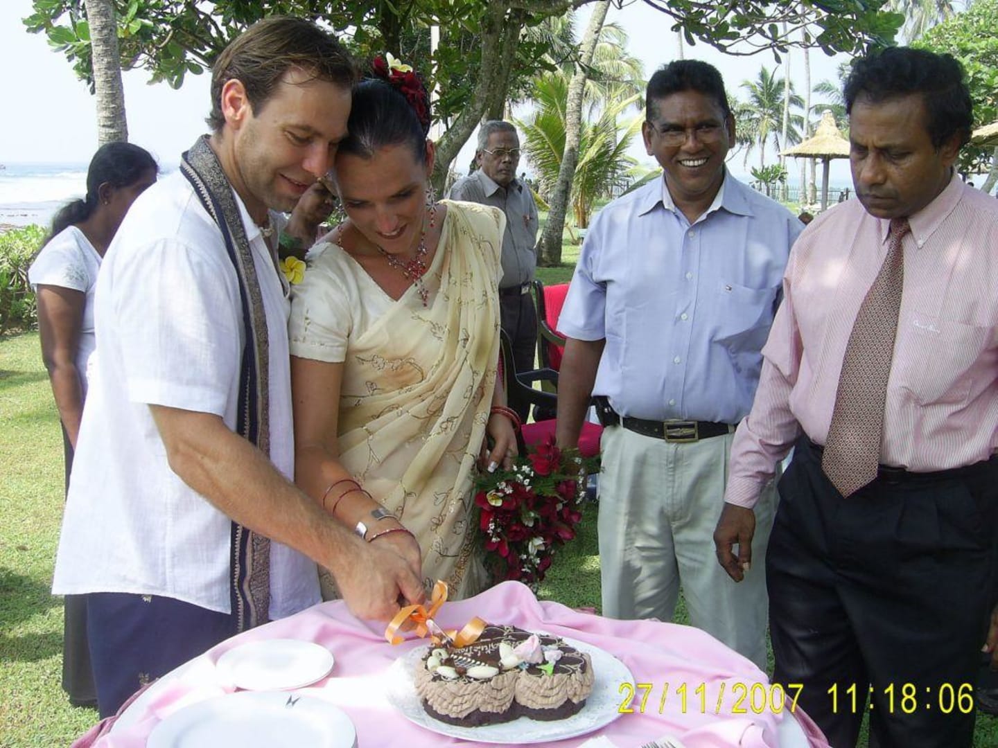 beim Torte anscheniden im Garten mit Hotelangestellten