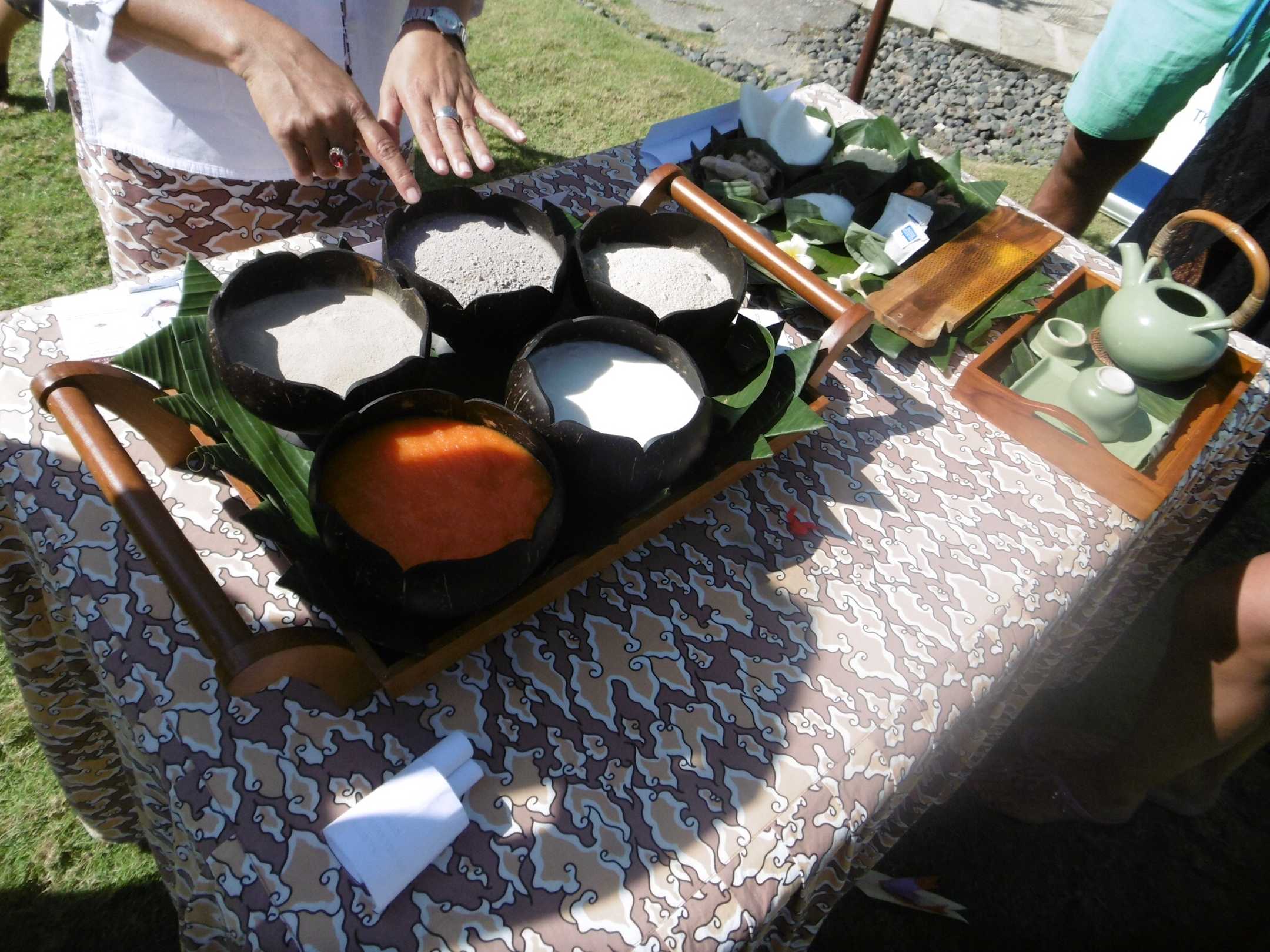 Vorführung von Massage Produkten, Ingwer Tee und Erfrischungstücher falten