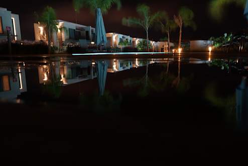 GartenanlageSurreale Ansicht der Lakehouseanlage - die Spiegelfläche ist tagsüber Rasen, die blaue Platte mittig - ein Pool