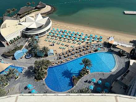 Pool und Strand vom Balkon fotografiert